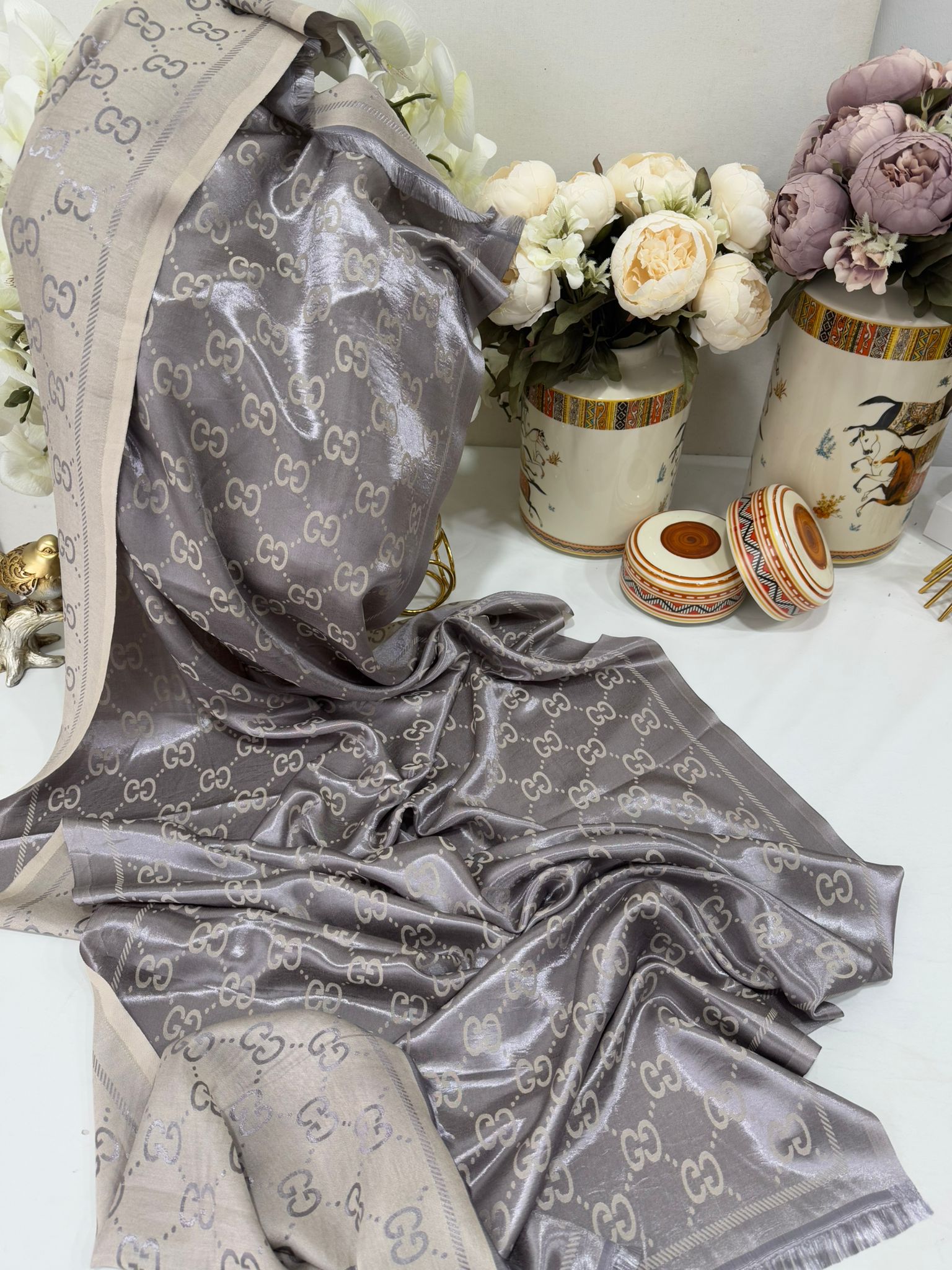 G Desen İpek Jakar Çift Renk Şal – Vizon